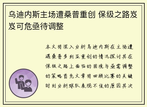 本文将深入分析乌迪内斯在主场遭遇桑普多利亚重创的情况,探讨其在保级之路上面临的困境与亟需调整的策略。首先,文章将回顾比赛的关键时刻,分析球队表现不佳的原因。其次,将探讨球队管理层及教练的应对措施,以及球员状态和心理素质对比赛结果的影响。接着,文章将讨论如何通过战术调整和引援来改善球队表现。最后,总结乌迪内斯需采取的具体措施,以确保在赛季结束前顺利保级。