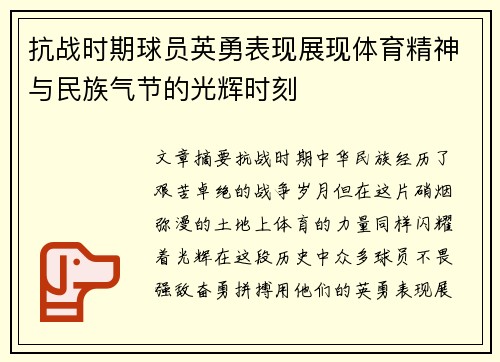 文章摘要:抗战时期,中华民族经历了艰苦卓绝的战争岁月,但在这片硝烟弥漫的土地上,体育的力量同样闪耀着光辉。在这段历史中,众多球员不畏强敌、奋勇拼搏,用他们的英勇表现展现了体育精神与民族气节的伟大时刻。这些球员不仅在赛场上拼搏,也在抗战的浪潮中书写了属于他们的英雄篇章。本文将从四个方面详细阐述抗战时期...