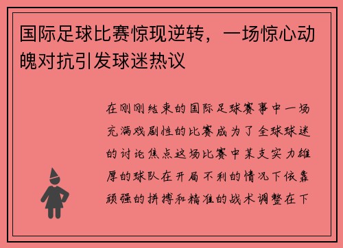 在刚刚结束的国际足球赛事中,一场充满戏剧性的比赛成为了全球球迷的讨论焦点。这场比赛中,某支实力雄厚的球队在开局不利的情况下,依靠顽强的拼搏和精准的战术调整,在下半场实现了惊人的逆转,最终以一分之差赢得了比赛。这不仅让现场的观众为之疯狂,也让无数足球迷通过社交媒体表达了对这场比赛的赞叹。 比赛的初期,...