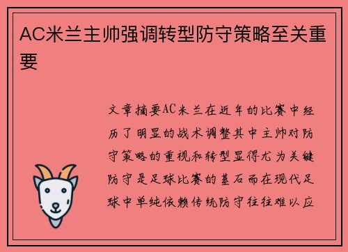 文章摘要:AC米兰在近年的比赛中经历了明显的战术调整,其中主帅对防守策略的重视和转型显得尤为关键。防守是足球比赛的基石,而在现代足球中,单纯依赖传统防守往往难以应对日益复杂的进攻战术。为了提升球队整体竞争力,AC米兰主帅特别强调了防守策略的转型,认为这是球队成功的重要保障。本文将从四个方面详细阐述这...