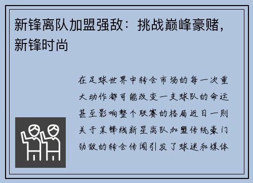 在足球世界中,转会市场的每一次重大动作都可能改变一支球队的命运,甚至影响整个联赛的格局。近日,一则关于某锋线新星离队加盟传统豪门劲敌的转会传闻,引发了球迷和媒体的热议。这位年轻球员的选择不仅让原俱乐部的球迷感到震惊,也让整个足坛为之侧目。他究竟为何选择离开?他的决定又将带来怎样的影响?让我们一起走进...