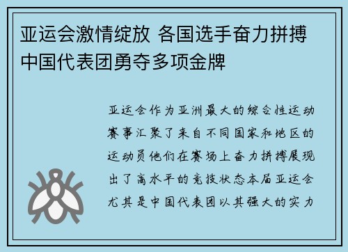 亚运会作为亚洲最大的综合性运动赛事,汇聚了来自不同国家和地区的运动员,他们在赛场上奋力拼搏,展现出了高水平的竞技状态。本届亚运会,尤其是中国代表团,以其强大的实力和不懈的努力,在多个项目中取得了令人瞩目的成绩,勇夺多项金牌。这不仅仅是对运动员个人努力的肯定,也是对整个团队协作与国家体育实力的体现。通...