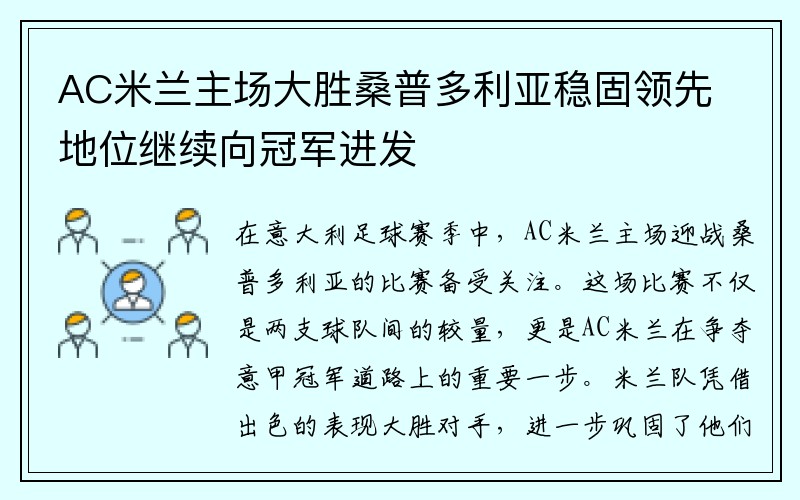 在意大利足球赛季中,AC米兰主场迎战桑普多利亚的比赛备受关注。这场比赛不仅是两支球队间的较量,更是AC米兰在争夺意甲冠军道路上的重要一步。米兰队凭借出色的表现大胜对手,进一步巩固了他们在积分榜上的领先地位。在这篇文章中,我们将从四个方面深入分析AC米兰这场胜利的意义,包括球队战术的成功实施、球员个人...